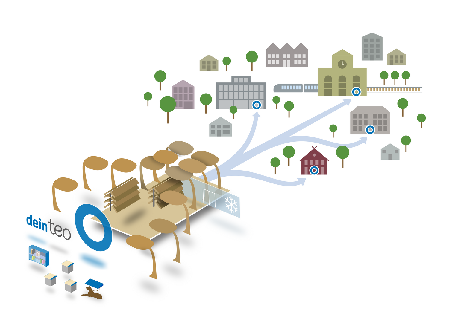 Mach gerne eine kleine Pause auf der Bank, schließe Dein Fahrrad am teo ab oder pumpe Deine Reifen auf. Auch für Deinen Vierbeiner hat teo einen schützenden Platz. Bist Du ein Bücherwurm und tauschst gerne Bücher oder Magazine? Dank den Plug-Ins wie einem Rastplatz, einem Fahrrad-Parkplatz inklusive Fahrradpumpe und -werkzeug, der Hundestation oder dem Bücher-Tauschregal bietet teo Treffpunkte für ein soziales Miteinander. Zusätzlich findest Du an manchen Standorten eine DHL-Station oder eine E-Bike-Ladestation als zusätzlichen Service.