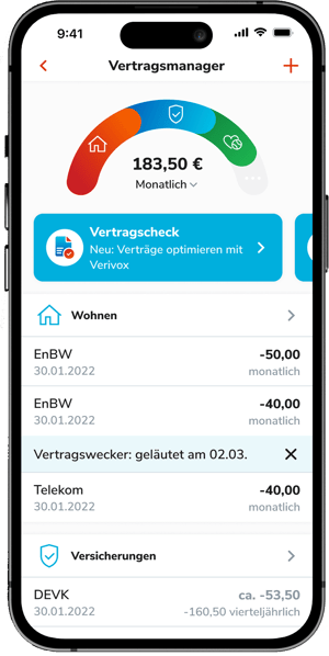- individuell einstellbarer Vertragswecker zur Erinnerung an Kündigungs- und Verlängerungsfristen